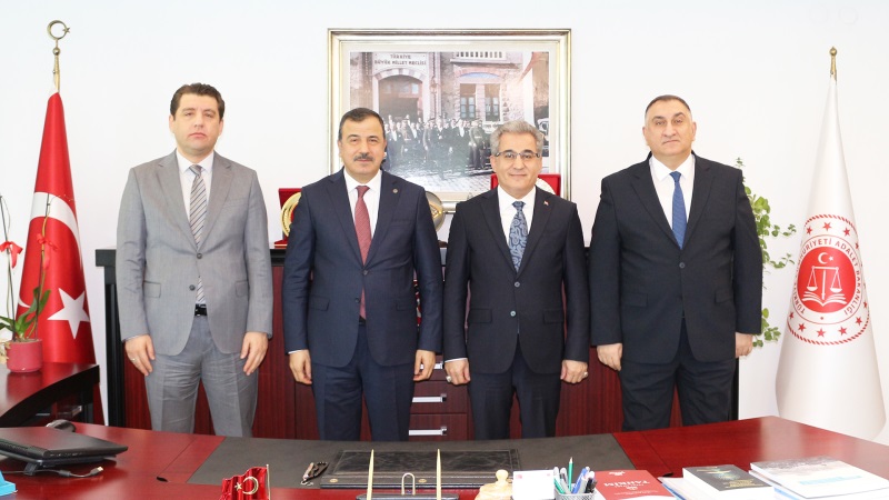Adalet Bakanlığı Hukuk Hizmetleri Genel Müdürü Sayın Abdurrahim TAŞ, Genel Müdür Yardımcısı Sayın Yusuf Kenan ZOR ile Daire Başkanı Sayın Selim SOYLAR, Başkanımız, Sayın Cemil Hulusi PARLAK'ı makamında ziyaret etti.